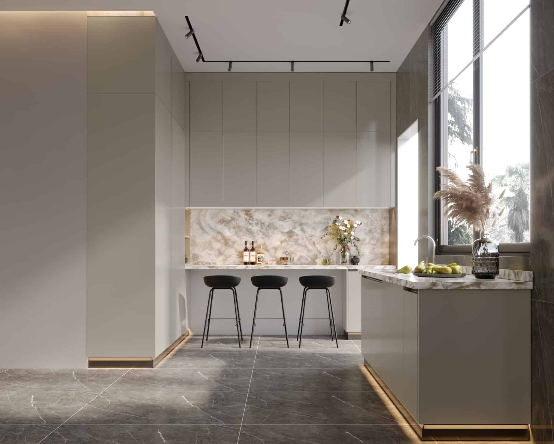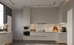 Contemporary kitchen, matte grey color to the ceiling is clear. The simple design matte black concealed handles and Luxury countertop, combined with all-matte grey cabinets, create an elegant and noble atmosphere.